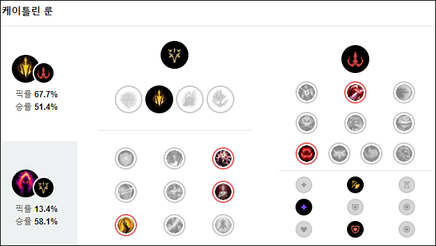 케이틀린 룬으로는 정밀에 치명적 속도를 들어줍니다. 사거리도 늘어나고, 빨리 패기도 좋습니다. 마나 부족으로 침착, 흡혈의 핏빛 길, 최후의 일격을 들어주고, 보조에는 지배에서 흡혈 룬들을 들어주시면 되겠습니다.